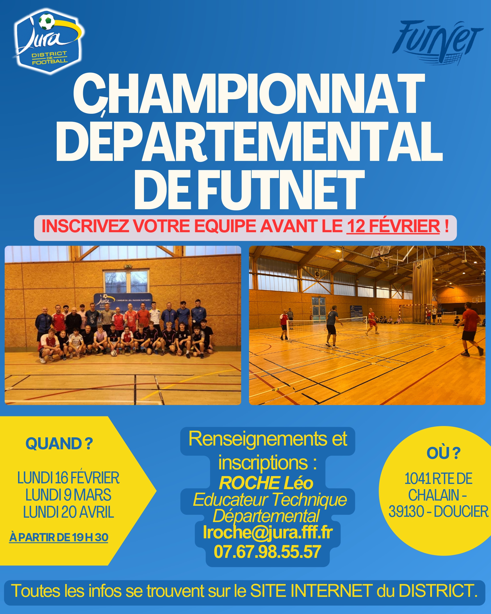 Le District organise un Championnat Départemental de Futnet, une discipline spectaculaire mêlant technique, précision et esprit collectif. Ce championnat se déroulera sur trois soirées, au Gymnase de la MFR de Doucier, dans une ambiance conviviale et compétitive.