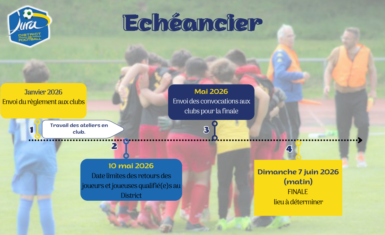 Philosophie : Avec la mise en place de ce concours, le District du Jura de Football souhaite mettre l’accent sur l’importance du travail technique lors de nos séances d’entraînements avec nos jeunes joueurs et jeunes joueuses. Le concours n’est pas une fin en soi, il n’a aucun caractère obligatoire. Les clubs participent s’ils le souhaitent.